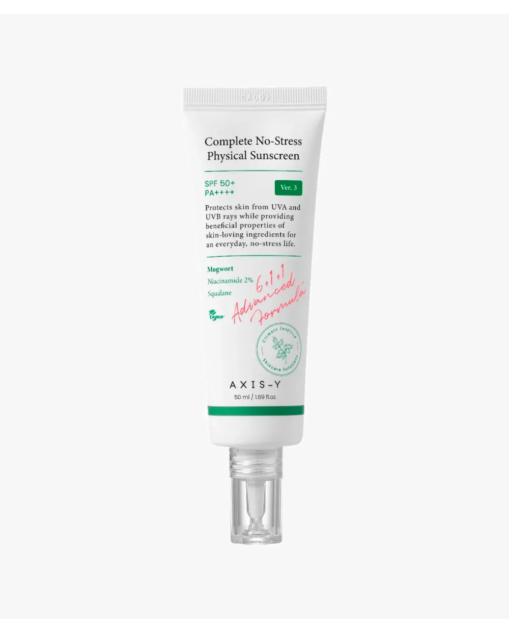 AXIS-Y Complete No-Stress Physical Sunscreen V.3 es un protector solar físico de amplio espectro SPF 50+ PA++++, ideal para pieles sensibles, con ingredientes calmantes que protegen y cuidan la piel frente a los rayos UVA/UVB y el estrés ambiental.