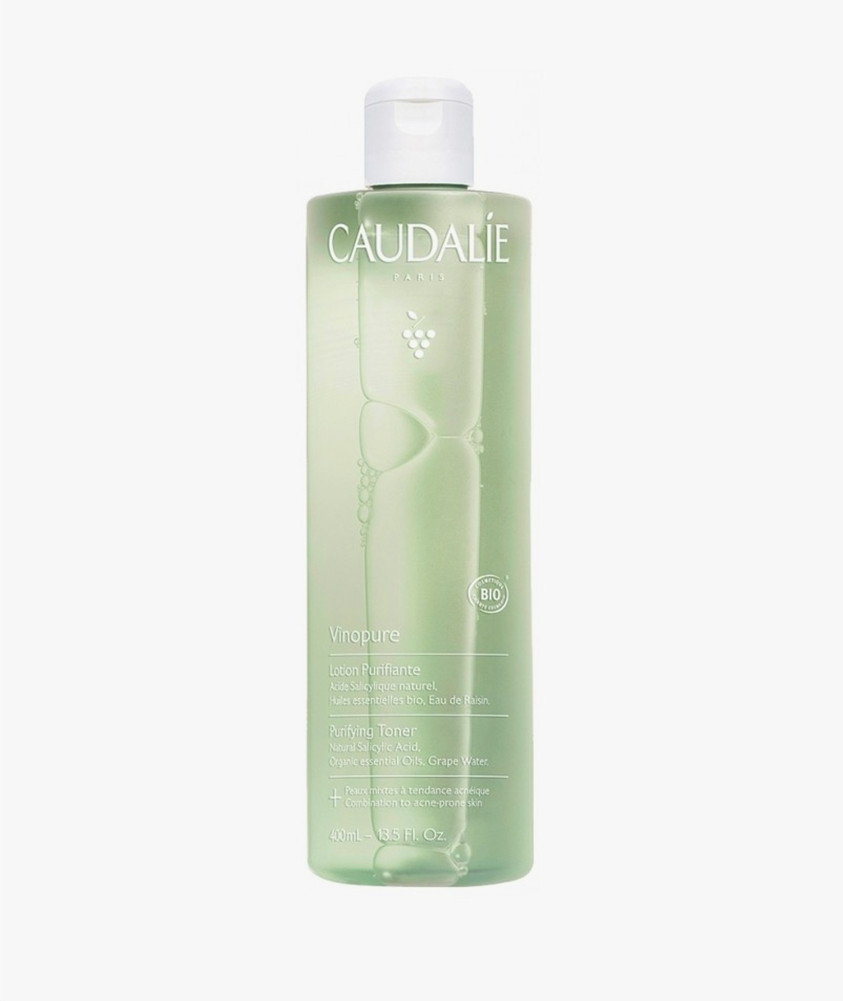 Caudalie Vinopure Tónico Purificante es el primer paso esencial en la rutina de cuidado de las pieles con tendencia a imperfecciones. Formulado con un 99% de ingredientes de origen natural, contiene ácido salicílico 100% puro y de origen natural para desincrustar los poros y mejorar la textura de la piel. Además, está enriquecido con agua de uva biológica y aceites esenciales purificantes, que ayudan a hidratar, calmar y reducir los brillos. Su fórmula, no comedogénica, elimina el exceso de sebo y las impurezas, dejando la piel limpia, fresca y matificada. Se recomienda aplicar mañana y noche sobre la piel limpia, con un algodón o directamente con las yemas de los dedos.