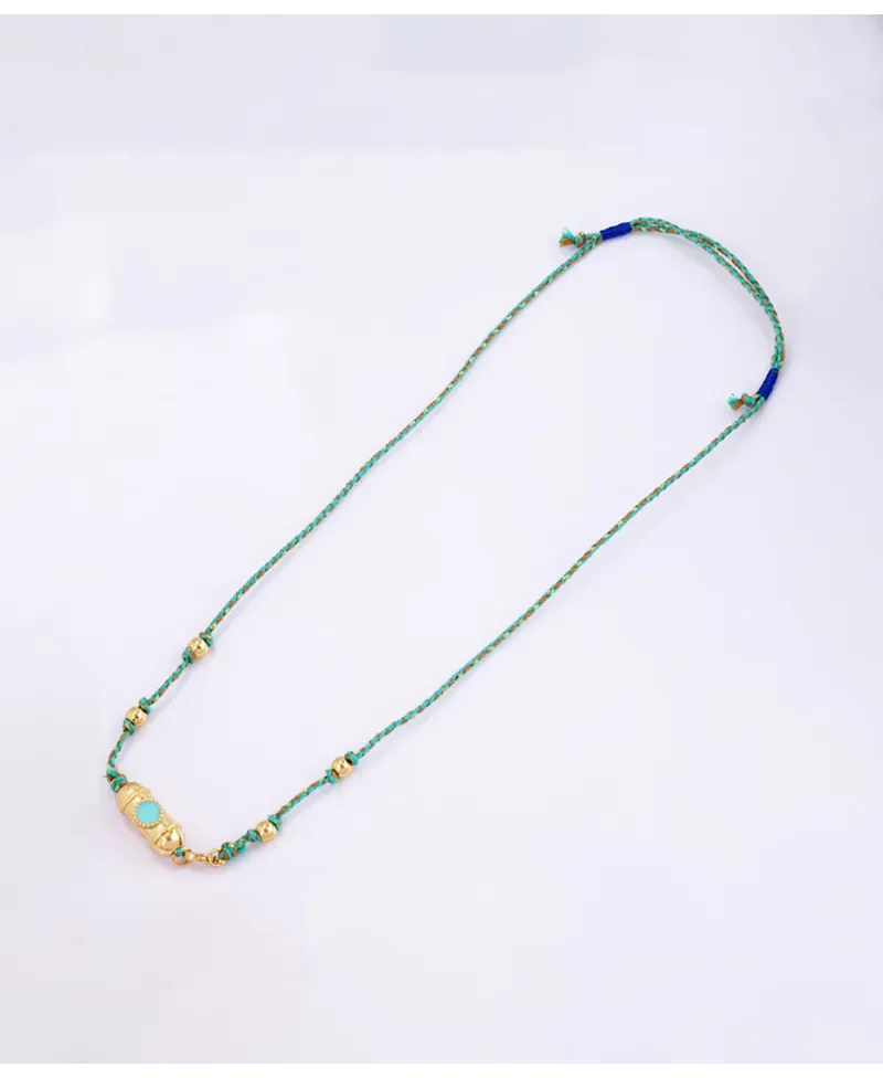 Este collar ajustable estilo festival, está confeccionado con cordón de seda dorado brillante y presenta un amuleto esmaltado y cuentas de esmalte dorado.