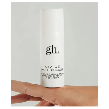 Crema de textura ligera formulada con ácido azelaico puro al 10 %, extractos de regaliz y jengibre y silicona vegetal. Indicada para mejorar las imperfecciones de acné y la pigmentación irregular, manteniendo la elasticidad de la piel. Acción antibacteriana frente a acnes, bacterias aeróbicas y anaeróbicas, inhibiendo el desarrollo de las bacterias implicadas en el acné comedoniano y papulopustular leve a moderado. Propiedades sebostáticas mediante la inhibición de la actividad de la 5 alfa reductasa. Función despigmentante por su inhibición competitiva de la tirosinasa, disminuyendo la síntesis de melanina y posee acción citotóxica frente al melanocito ya que elimina las células que presentan alguna alteración. Indicado en melasma y en hiperpigmentación postinflamatoria por acné.