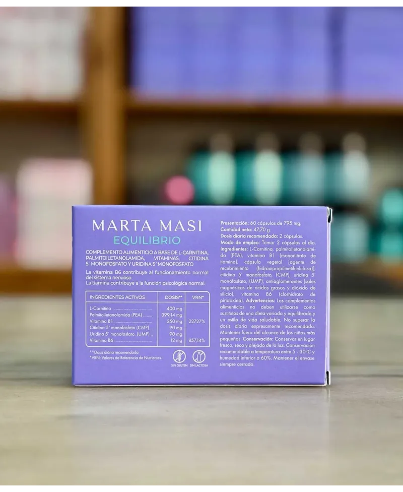 Ingredientes: L-Carnitina, palmitoiletanolamida (PEA), vitamina B1 (mononitrato de tiamina), cápsula vegetal [agente recubrimiento (hidroxipropilmetilcelulosa)], citidina 5’ monofosfato, sal disódica (CMP), uridina 5’ monofosfato, sal disódica (UMP), antiaglomerantes (sales magnésicas de ácidos grasos y dióxido de silicio), vitamina B6 (clorhidrato de piridoxina).