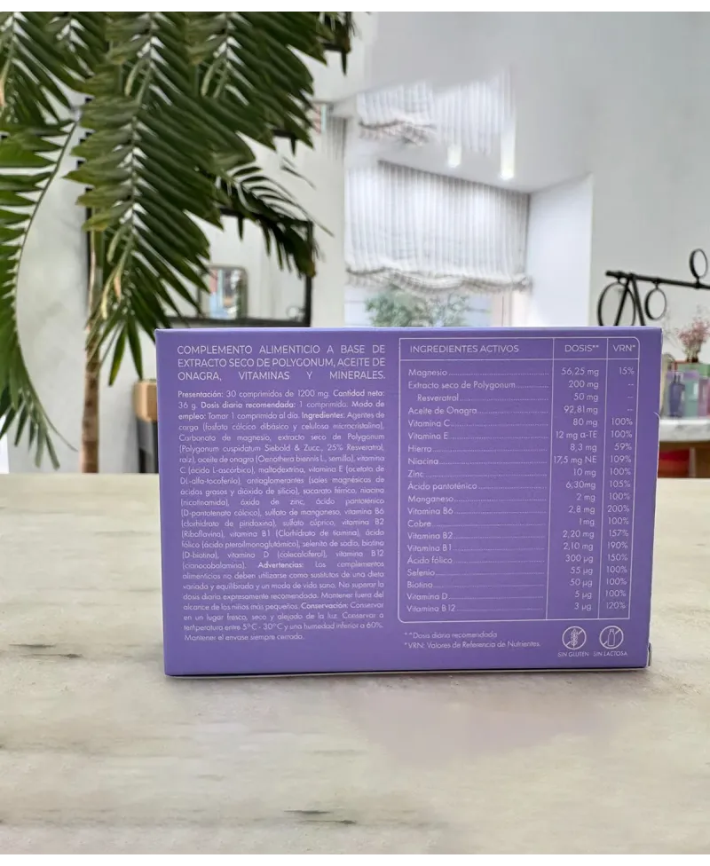 Carbonato de magnesio 220,60mg (56,25mg de Magnesio, 15%VRN*), Agente de carga (Fosfato de calcio dihidrato), Extracto seco de Poligonum (Polygonum cuspidatum Siebold & Zucc, 25% Resveratrol) 200mg, Agente de carga (Celulosa microcristalina), Aceite de Onagra (Oenothera biennis L.) 100mg, Vitamina C (Ácido L-ascórbico) 80mg (100%VRN*), Maltodextrina, Vitamina E (Acetato de DL-alfa-tocoferilo, 50%) 35,76mg (12mg de Vitamina E, 100%VRN*), Sacarato férrico 20,75mg (8,3mg de Hierro, 59%VRN*), Niacina (Nicotinamida) 17,5mg (109%VRN*), Antiaglomerante (Sales magnésicas de ácidos grasos), Óxido de zinc 12,5mg (10mg de Zinc, 100%VRN*), Antiaglomerante (Dióxido de silicio), Ácido pantoténico (D-Pantotenato cálcico) 6,3mg (105%VRN*), Sulfato de manganeso 6,16mg (2mg de Manganeso, 100%VRN*), Vitamina B6 (Clorhidrato de piridoxina) 2,8mg (200%VRN*), Sulfato cúprico 2,52mg (1mg de Cobre, 100%VRN*), Vitamina B2 (Riboflavina) 2,2mg (157%VRN*), Tiamina (Clorhidrato de tiamina) 2,1mg (190%VRN*), Ácido fólico (Ácido pteroilmonoglutámico) 300μg (150%VRN*), Selenito de sodio 0,1235mg (55μg de Selenio, 100%VRN*), Biotina (D-Biotina) 50μg (100%VRN*), Vitamina D3 (Colecalciferol) 5μg (100%VRN*), Vitamina B12 (Cianocobalamina) 3μg (120%VRN*). *%VRN: Valores de Referencia de Nutrientes.