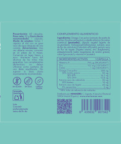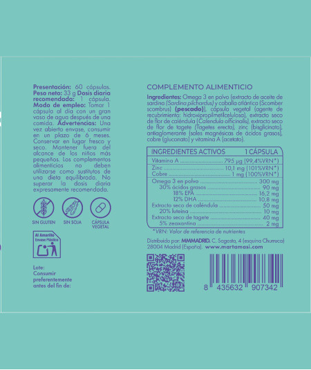 Omega-3 (300 mg, 18% EPA y 12% DHA): Importantes en la estructura de las membranas de la retina. El aporte de DHA favorece la integridad de la retina y la función visual. El DHA y EPA ayudan a mejorar la calidad de la película lagrimal y reducir inflamación. Procedentes de aceite de sardina y caballa atlántica.