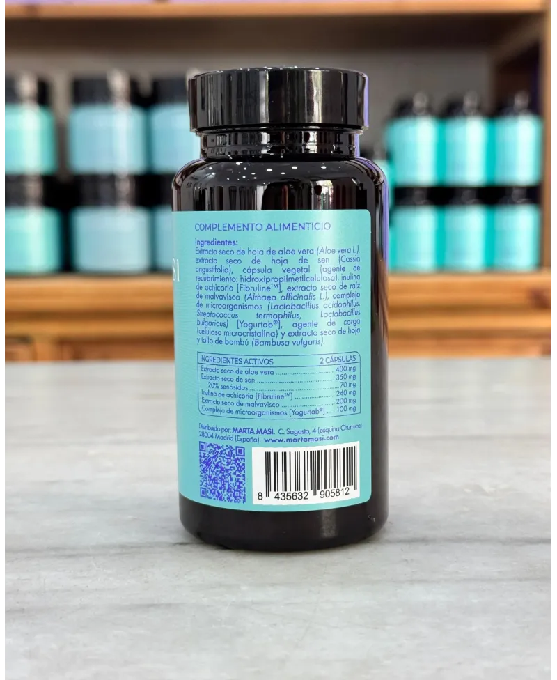 Complemento alimenticio de MM by Marta Masi que combina extractos secos de hojas de aloe vera y sen, raíz de malvavisco, inulina de achicoria y probióticos de la patente Yogurtab, formando una fórmula sinérgica diseñada para apoyar la salud digestiva y el bienestar general.