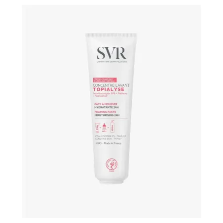 SVR Topialyse Espuma Lavante Concentrada 100 ml es una pasta espumosa especialmente diseñada para la piel seca y sensible de toda la familia, incluso la de los bebés (excepto los prematuros). Este producto versátil puede utilizarse para el cuerpo, el rostro y la higiene íntima.