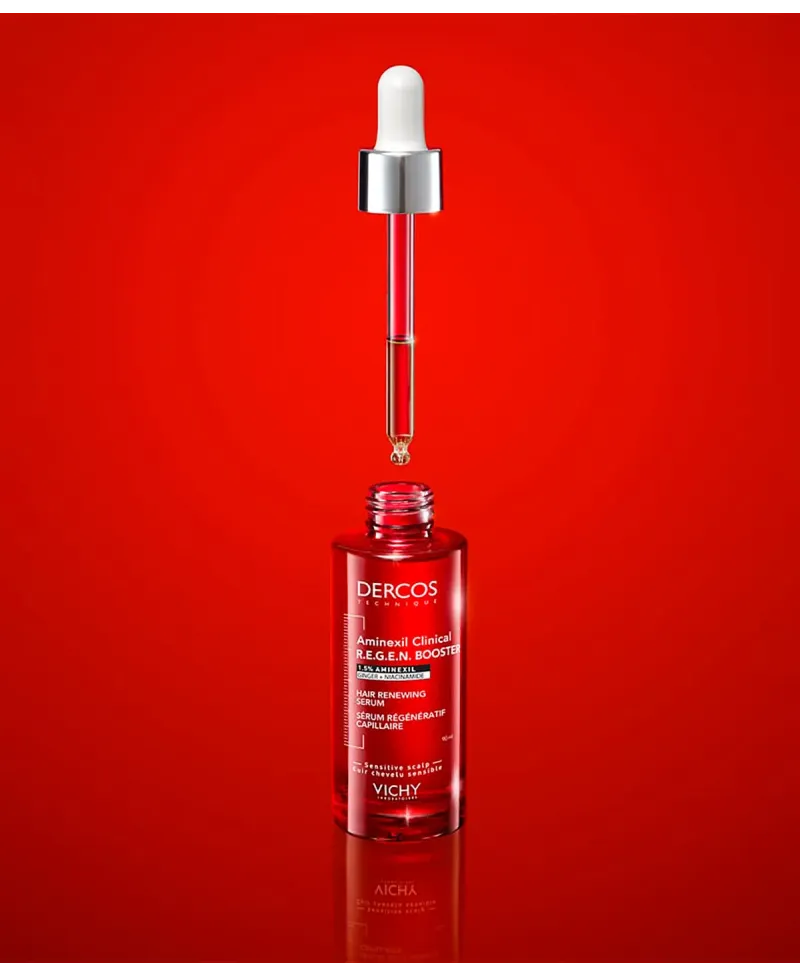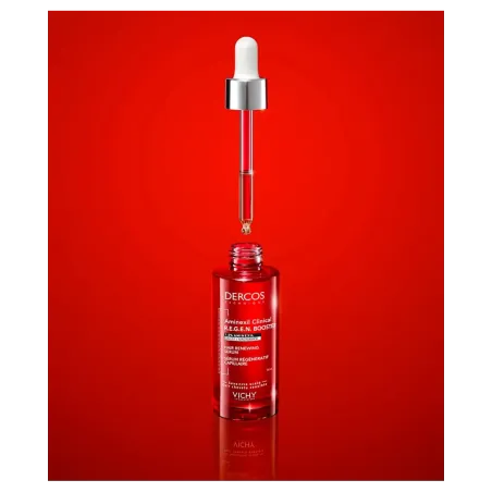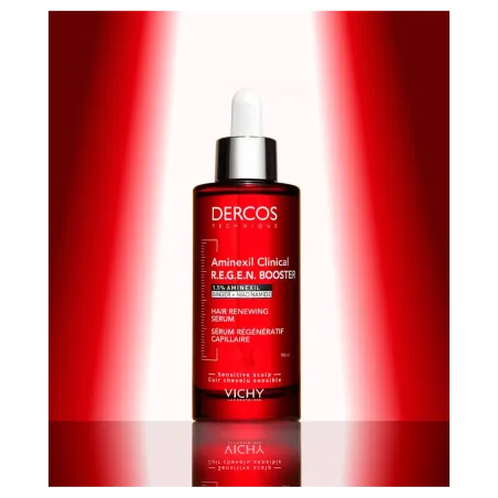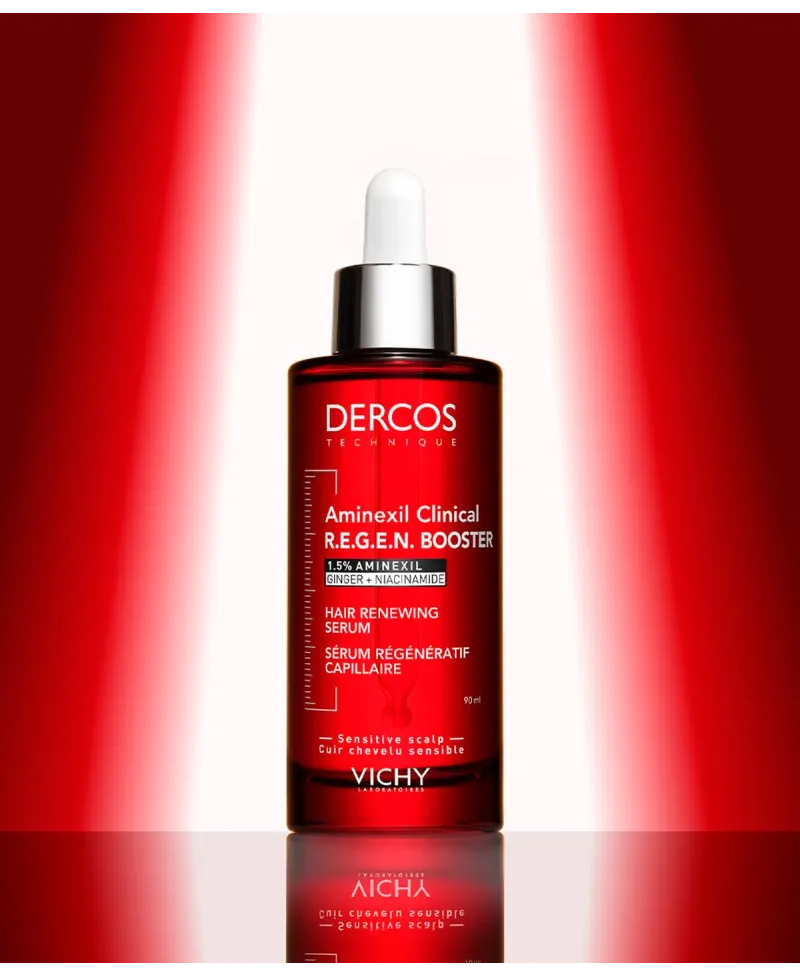 Vichy Dercos Sérum Capilar Aminexil Clinical R.E.G.E.N. Booster 90 ml es un tratamiento anticaída avanzado formulado para frenar la pérdida capilar y estimular el crecimiento de un cabello más fuerte y resistente. Su combinación de Aminexil, molécula patentada con eficacia clínica probada, junto con extractos fortificantes y activos antioxidantes, mejora la fijación del cabello en el cuero cabelludo y potencia su regeneración.